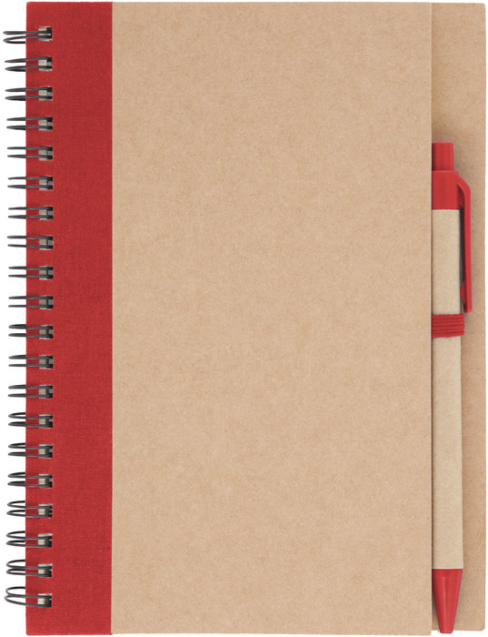 13,8 x 18 x 1,5 cm. Elaborada con papel reciclado. Incluye bolígrafo biodegradable. Con espiral metálico. Contiene 70 hojas lisas.