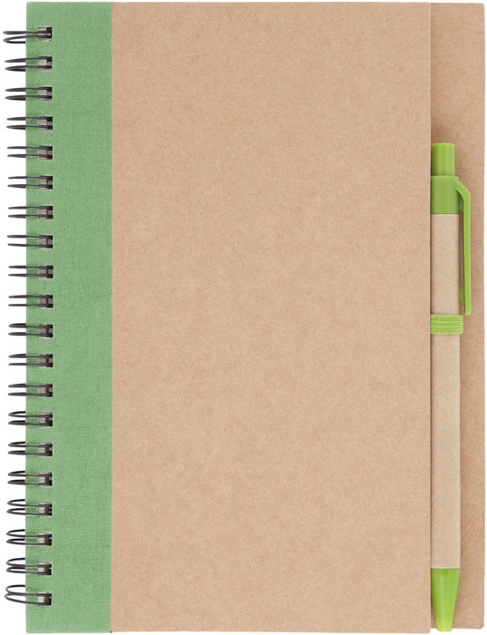 13,8 x 18 x 1,5 cm. Elaborada con papel reciclado. Incluye bolígrafo biodegradable. Con espiral metálico. Contiene 70 hojas lisas.