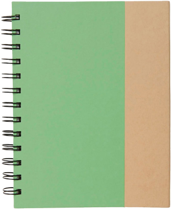 18 x 13.5 x 1 cm. Cuaderno de cartón con espiral. Dos autoadhesivos rectangulares (grande y mediano), cinco autoadhesivos señaladores de diferente color y bolígrafo de cartón con pulsador, clip y punta plásticos de color. 70 Hojas rayadas. Cierre imantado.